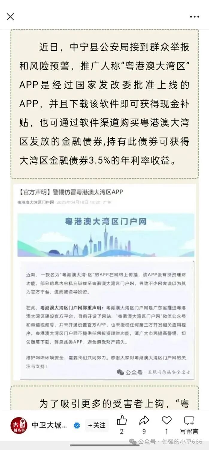 第一,你以为的“政府背书”,其实是“剧本杀”现场。 这个APP最初叫“粤港澳大湾区APP”,名字一出,瞬间拉满信任感——毕竟谁会怀疑“粤港澳大湾区”这种国家级战略?可没过多久,它悄然更名为“共建大湾区APP”,并放出大量“内部文件”“政策通知”,甚至伪造财政部、发改委的红头文件,格式、公章、文号一应俱全,连专业人士初看都难辨真伪。更绝的是,他们还搞“专家解读”“政策宣讲直播”,让你觉得这不是理财,而是“参与国家建设”。可真相是,广东省粤港澳大湾区门户网早已明确声明:从未推出任何APP,不提供投资功能,更未授权第三方发行金融产品。换句话说,你手机里的这个“共建大湾区”,根本就是个“影帝级”骗子,演得比真的还真。