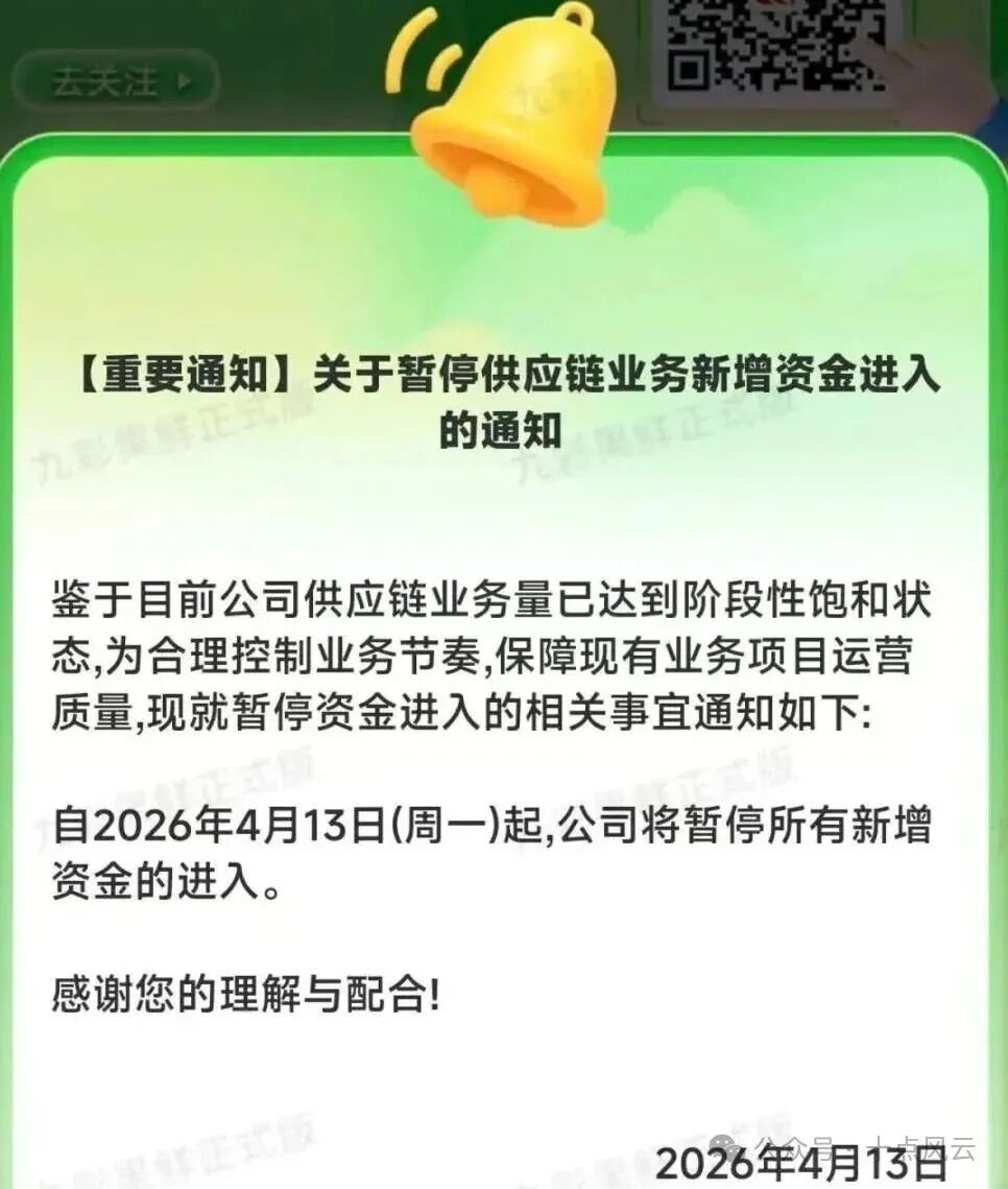 湖北保康警方明确指出,“九彩果鲜水果拼车” 属于拼团类电信网络诈骗套路,其收款账户已存在涉案预警记录,这不是 “投资项目”,是实打实的诈骗。 4 月 13 日,项目方发布 “暂停新增资金...