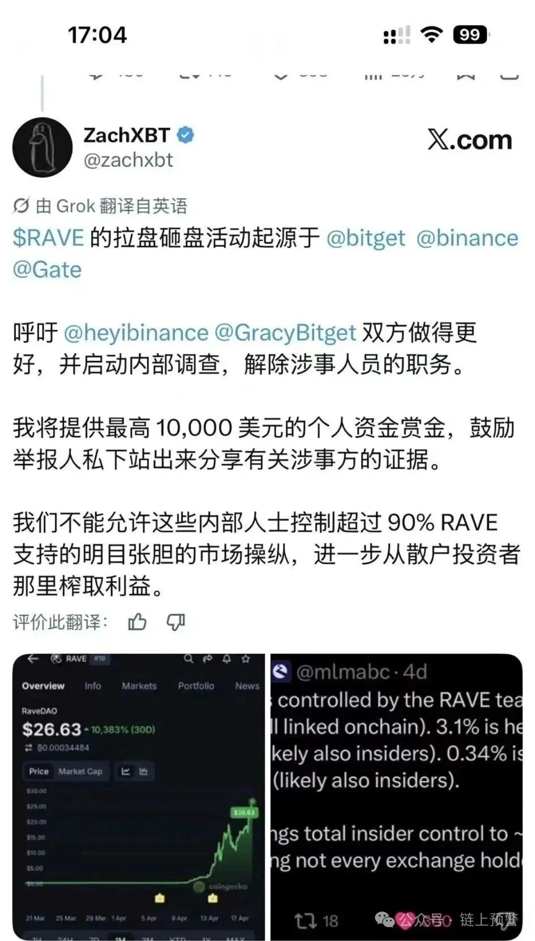 三、交易所沦为帮凶,100%控盘收割散户RAVE的这场疯狂涨跌,从来不是市场自然行为,而是赤裸裸的操盘收割。有业内人士爆料,RAVE的拉盘砸盘行为,从一开始就和bitget、binance、Gate等交易所脱不了干系。甚至有人拿出1万美元悬赏,呼吁交易所调查内部涉事人员,因为这些内部人士控制了超90%的RAVE筹码,明目张胆地操控市场,从散户身上榨取利益。从链上数据也能看出,RAVE大量筹码被团队和内部人士掌控,散户不过是他们砧板上的肉。拉涨百倍是为了猎杀做空的大户,再反手暴跌收割追涨的散户,最后一根K线直接把所有追涨的人都套牢,这哪里是投资,分明是明目张胆的抢劫。