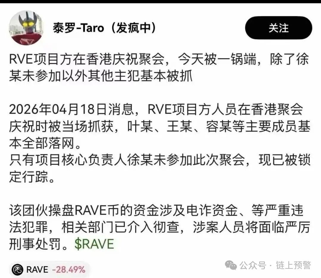 【RAVE】血崩90%!项目方香港聚会被一锅端,币圈收割局彻底撕破脸!