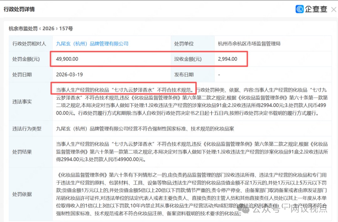 杭州市余杭区市场监督管理局发布的《杭余市监处罚﹝2026﹞157号》决定书显示,九尾玄(杭州)品牌管理有限公司因“七寸九云梦泽香水”产品不符合技术规范,遭监管部门没收91盒涉案产品及2994元违法所得,并被处以4.99万元罚款。