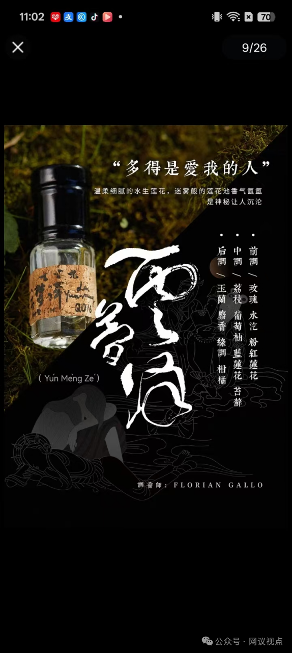 晨起梳妆,喷一抹国风香水,本是奔赴一场“云梦泽”般的诗意邂逅——前调有粉红莲花,中调有荔枝、葡萄柚,尾调有麝香、柑橘,这便是“七寸九云梦泽香水”传递的产品意象。 据清扬君舆...