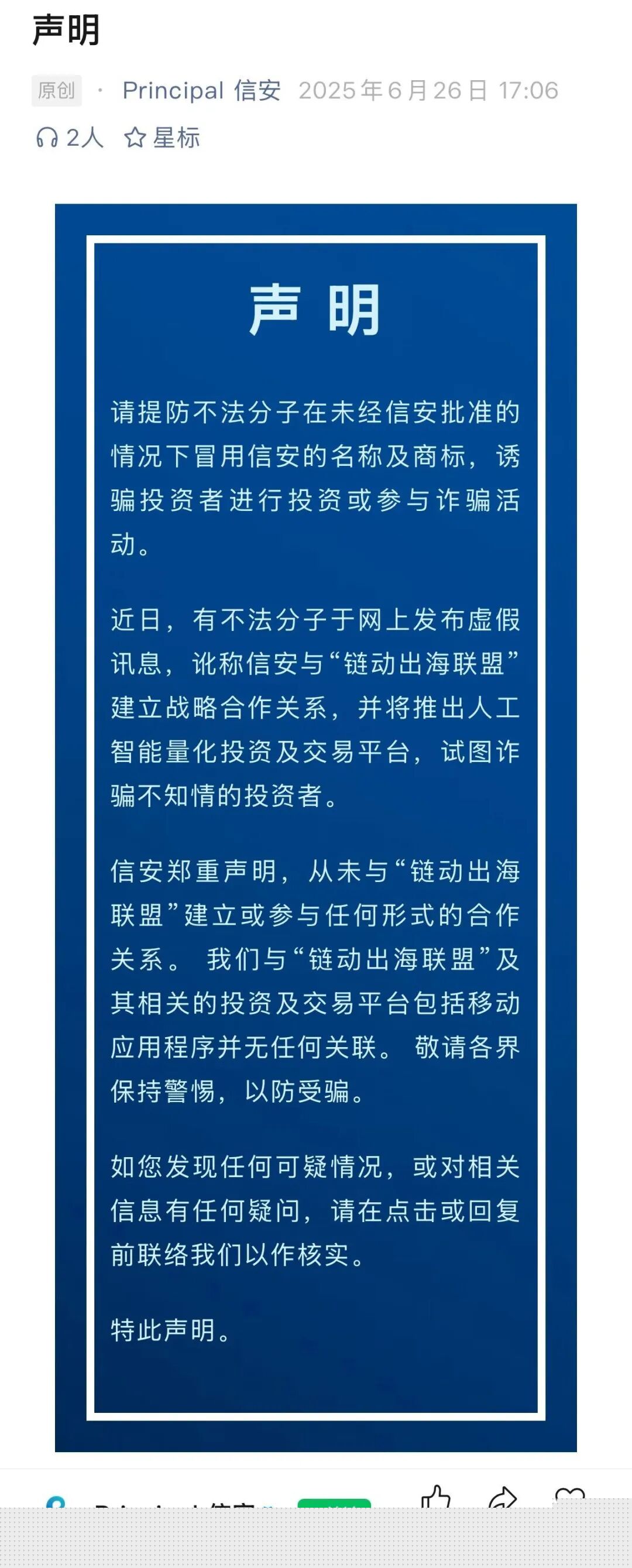 昊天评盘界友情提醒:套牌的“美国信安ai量化”链动出海联盟分红类资金盘骗局,正规公司出面打假,高度预警,速度撤离!近期昊天评盘界发现知乎,小红书,微博,抖音等app都有冒充昊天的诈骗团伙,希望大家记住了昊天评盘界是反诈自媒体账号并不做任何项目,更不会去推广任何项目,除公众号外其他一律不是本人,切勿上当受骗!