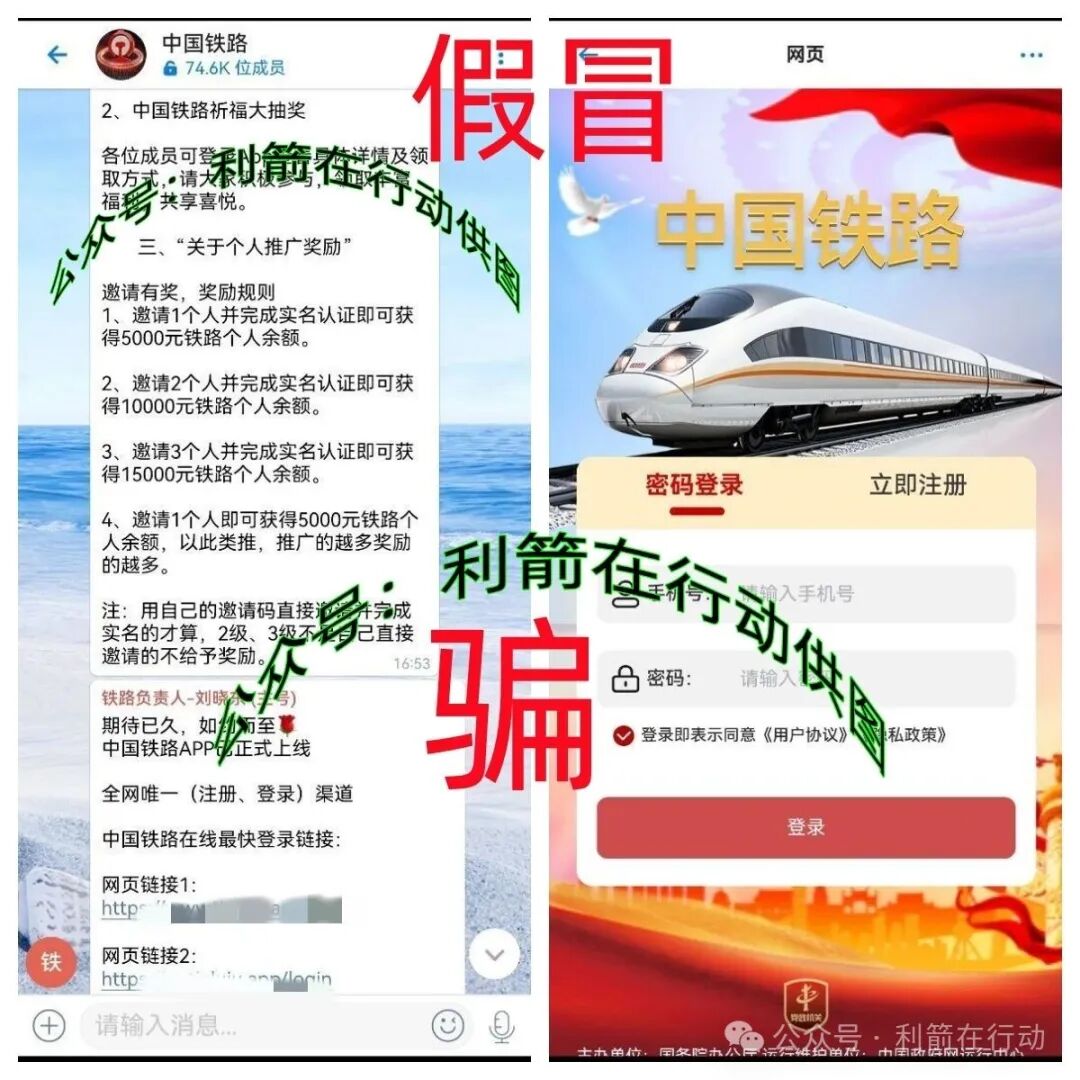 这几天网络中上线了假冒的“中国铁路”APP,该项目宣传“实名认证注册该APP,进入铁路公会中提交身份信息,7个工作日审核通过最高可领取537万元,邀请人来注册,就有资格抽取以下奖品:铁路...
