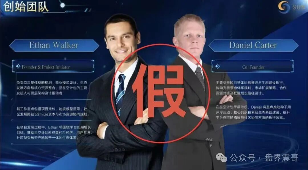 • 团队信息全是伪造的“外籍精英”:项目公示的Ethan Walker、Daniel Carter等外籍创始团队,以及Ryan Mitchell等技术、运营人员,照片大概率是网图拼凑的虚假人物,没有任何公开的区块链行业履历可查。资金盘惯用这种“外籍团队”的设定,就是为了制造距离感,方便后续卷款跑路时隐匿踪迹。